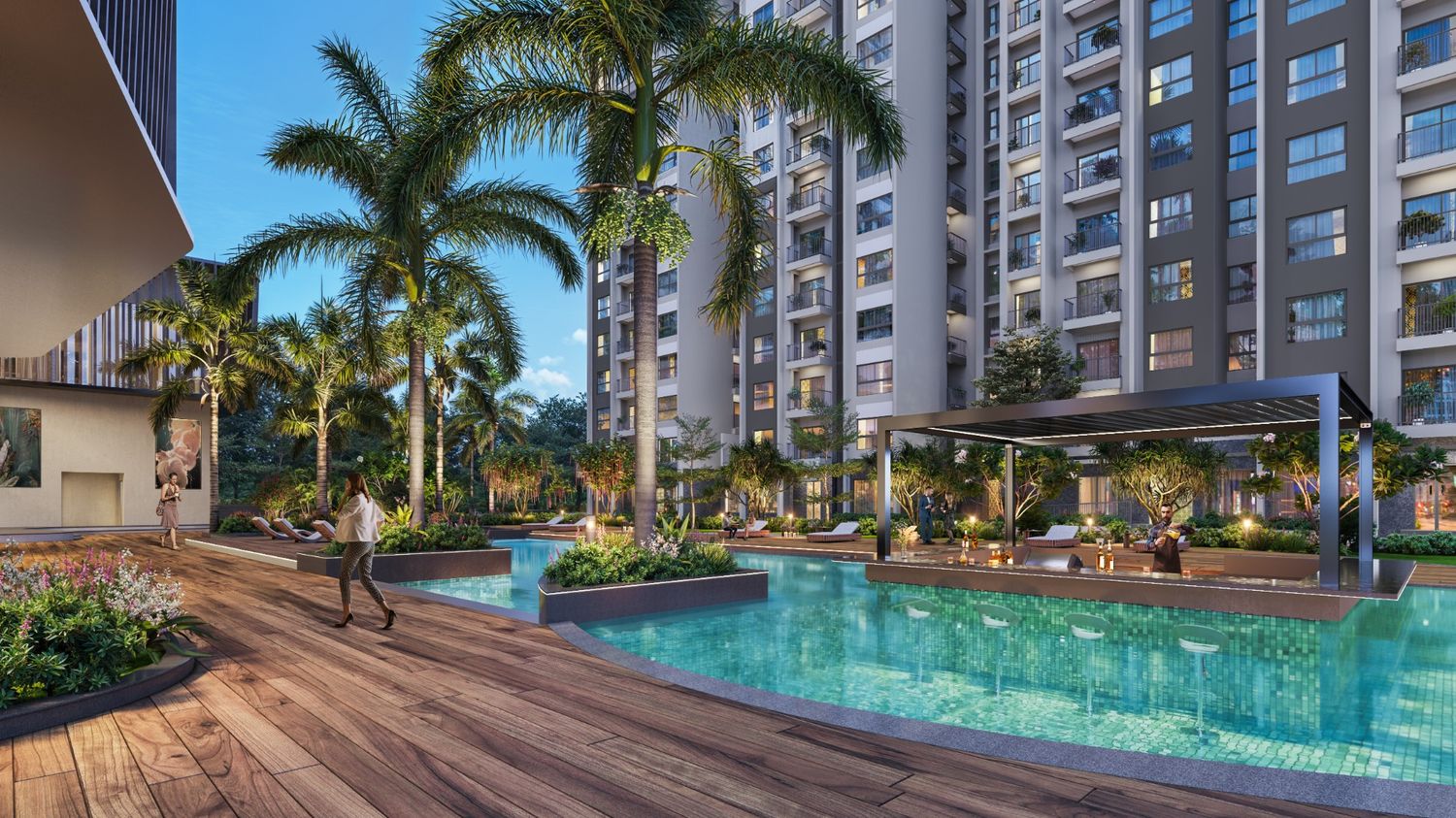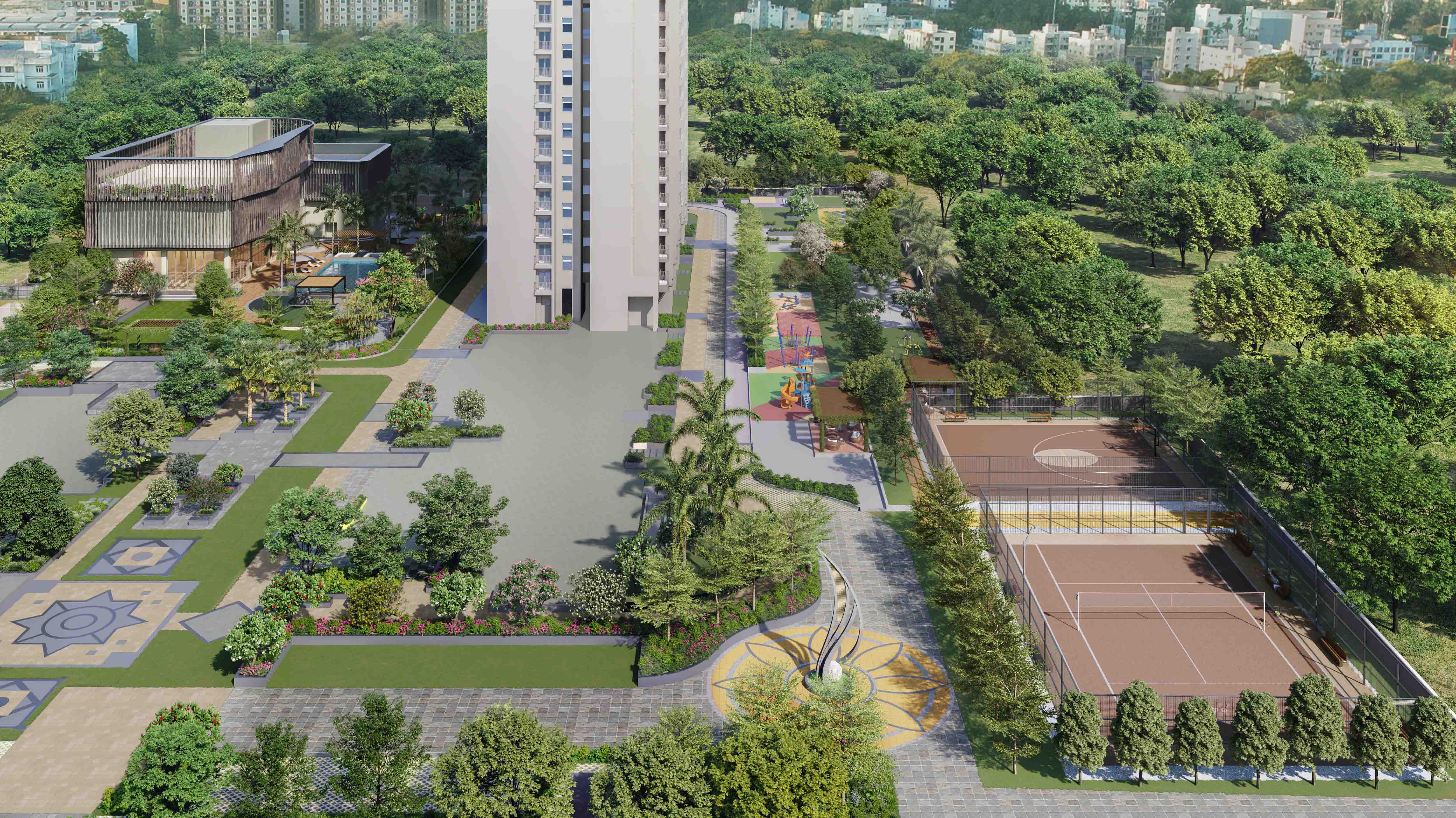 Step into a world where every corner is designed for connection, recreation, and celebration. Our 21,000 sq.ft. ultra-modern clubhouse welcomes you with a double-height, 5-star ambience lobby and lounge, offering spaces to meet, mingle, or simply unwind. From AV rooms, banquet halls, and meeting pods to indoor games and quiet seating areas, there’s a space for every mood and every moment. Mornings begin with serene yoga sessions, and evenings come alive with vibrant celebrations. With 117 thoughtfully curated amenities, residents of all ages can enjoy family-sized swimming pools with sunken bars, amphitheatres, outdoor gyms, yoga lawns, jogging and cycling tracks, trampoline parks, adventure zones, and sports courts.